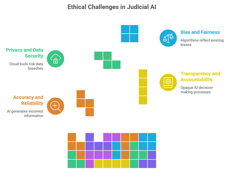 - Opaque Decision-making: AI systems, especially generative models, may lack explainability—jeopardizing accountability in judicial reasoning.