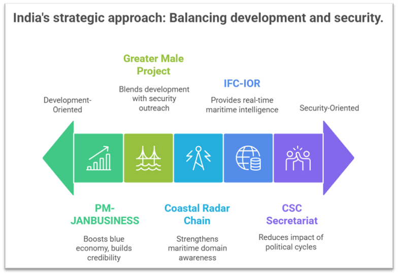 Example: Maldives’ oscillation between the ‘India First’ and ‘India Out’ campaigns has directly affected maritime cooperation, access to EEZ surveillance, and trilateral naval exercises.