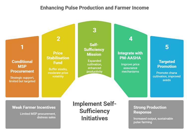 • Example – Madhya Pradesh’s pulse expansion drive: Targeted promotion of chana cultivation with improved seed varieties increased productivity, demonstrating that technology and extension services can complement price policy.