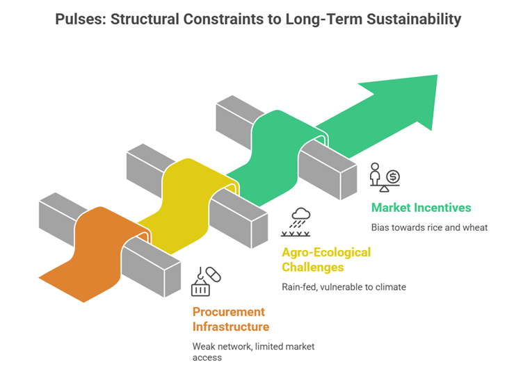 • Farmers often shift acreage toward crops with assured procurement and lower risk, such as rice and wheat, creating a structural bias against pulses.