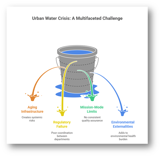 - Leaking pipelines, outdated water treatment facilities, and poor coordination between water supply and sewerage departments create systemic risks. Contamination often results from neglect rather than scarcity.