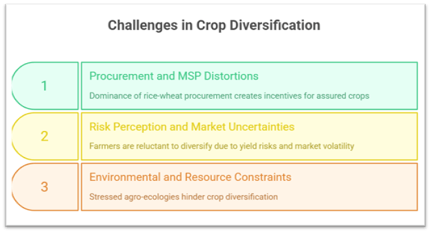 - Crop diversification is hindered by stressed agro-ecologies where soil health and water tables have already collapsed under continuous cereal cultivation. Adoption of alternative crops requires restoration of soil organic carbon, balanced fertilization, and micro-irrigation.