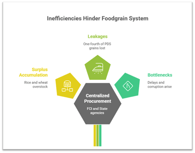 - Over-centralised procurement through FCI and State agencies results in surplus accumulation of rice and wheat, with limited capacity to procure and store pulses and oilseeds scientifically. Reports highlight leakages up to one-fourth of PDS grains, indicating inefficient food movement.