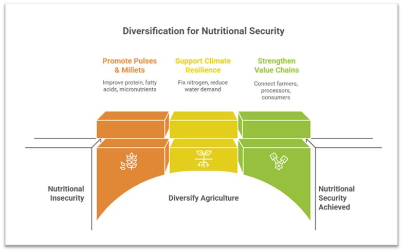 - Government Interventions: PM-POSHAN, ICDS, and National Millet Mission integrate diversification into nutrition programs.