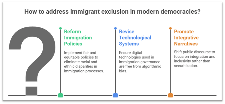 Exclusionary immigration frameworks in modern democracies often mirror and reproduce racial and cultural biases through structural, institutional and cultural dimensions. These frameworks are not merely border-management tools but are embedded in historical legacies of exclusion, nation-state identity formation, and power hierarchies of race and culture. Empirical evidence—from racial disparities in asylum adjudication in the U.S. to nativist public attitudes and digital biases—demonstrates how exclusion is operationalised. For democracy to uphold its ideals of equality, dignity, and inclusion, it must critically examine and reform immigration frameworks that implicitly or explicitly discriminate. Going forward, states should enhance transparency in immigration decision-making, strengthen safeguards against racial or cultural profiling, invest in integration and recognition of migrants as full social actors, and align domestic policy with international human rights norms.