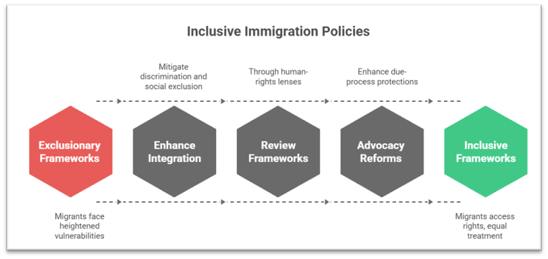 Many OECD states are now enhancing integration policies to mitigate discrimination and social exclusion: e.g., language and civic orientation requirements in Belgium, Norway’s “Action Plan Against Racism and Discrimination (2024-27)”, Germany’s anti-racism programmes. Some states are reviewing immigration frameworks through human-rights lenses: the UN Committee on the Elimination of Racial Discrimination emphasises that differential treatment based on immigration status constitutes racial discrimination if not justified legitimately and proportionately. Advocacy organisations call for reforms: in the U.S., recommendations include ending mass migration-related prosecutions, revising asylum adjudication systems to reduce extraneous decision-influences, and enhancing due-process protections for racialised migrant groups.