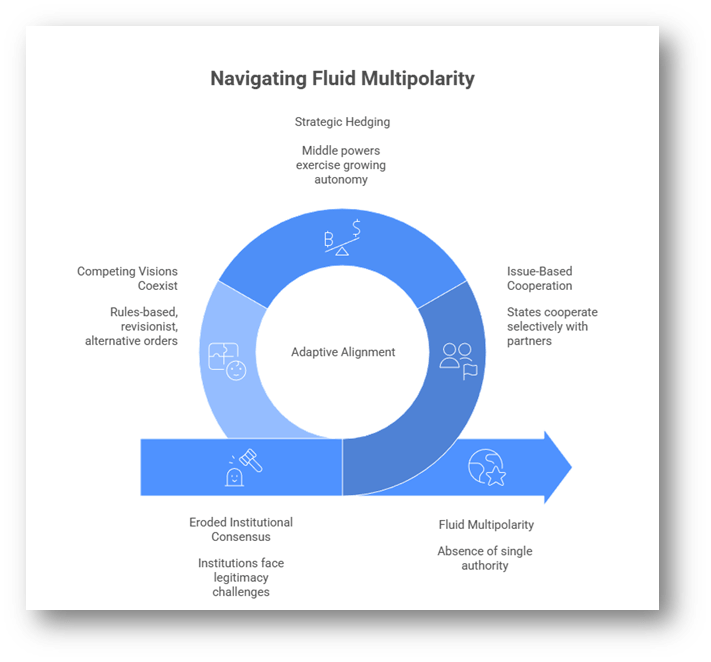 - The contemporary international system is witnessing a transition from the post–Cold War unipolar moment to a more complex distribution of power often described as “fluid multipolarity.” Unlike classical multipolar systems marked by stable alliances and clearly demarcated spheres of influence, today’s order is characterised by shifting alignments, issue-based partnerships, and strategic hedging by both great and middle powers.