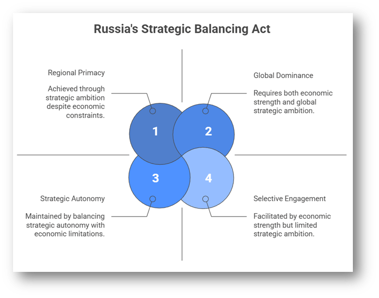 - Russia’s strategic objective centres on restoring primacy in its near abroad rather than global dominance.