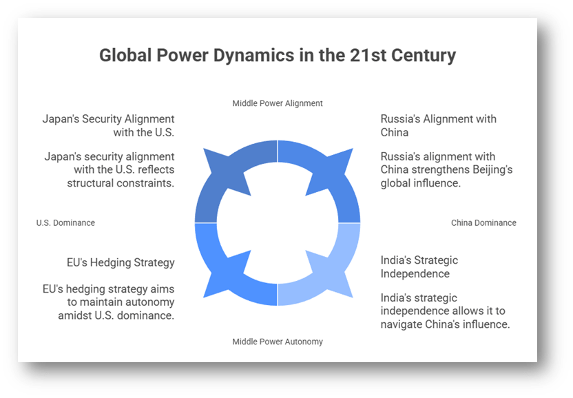 - Power is distributed among multiple actors—primarily the U.S., China, and Russia—while middle powers such as India, Brazil, Germany, and Japan exercise growing autonomy through strategic hedging.