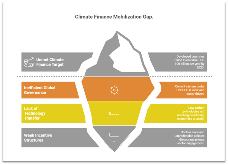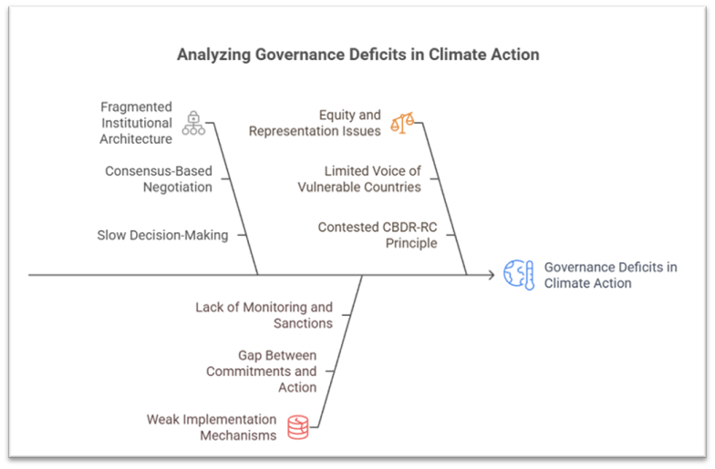 - The institutional deficit: limited voice of vulnerable countries, sub-national actors, and civil society in decision-making, and no robust enforcement of differentiated obligations.