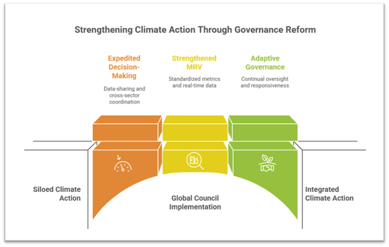 - Many analyses argue the current UNFCCC regime lacks agility. A global council could serve as a standing governance architecture, rather than episodic COP-driven negotiations.