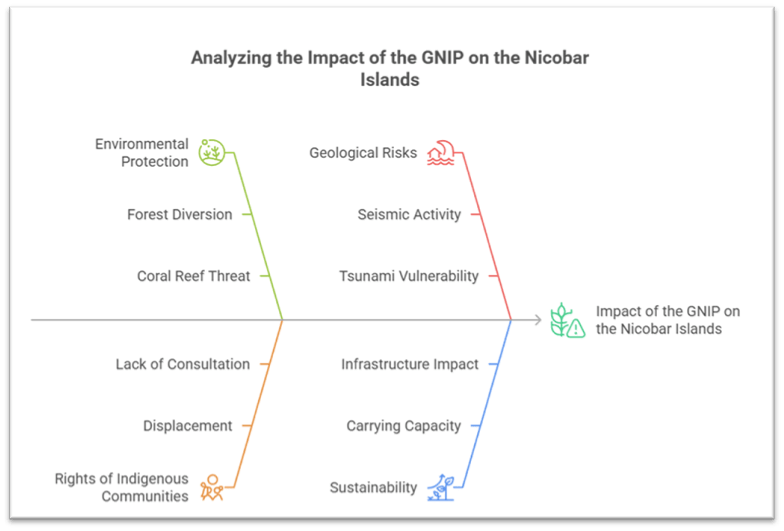 • India is party to international commitments (e.g., Convention on Biological Diversity) and domestically bound by the Environment Protection Act, Forest Conservation Act, Biodiversity Act and coastal regulation zones (CRZ). The GNIP involves diversion of ~130 sq km of forest land, potential clearance of thousands/millions of trees, threat to coral reefs and mangroves.