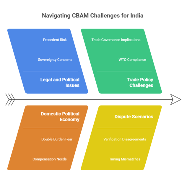 - Political contradiction and legal optics: Accepting CBAM deductions effectively recognises a mechanism that India has previously criticised at multilateral fora as potentially protectionist; this creates diplomatic friction and domestic political optics of legitimising a contested instrument. (Example/Case study: India’s WTO and UNFCCC positions on unilateral trade-related climate measures.)