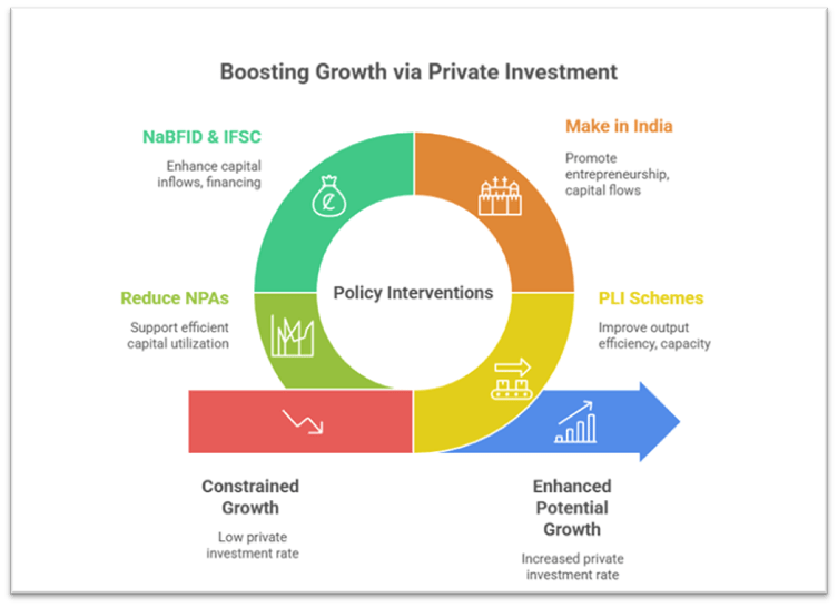 • India’s potential growth rate of around 6.5% reflects a delicate balance between investment quantity (GFCFR) and efficiency (ICOR). While public investment has anchored infrastructure and stabilized growth post-pandemic, private investment remains the decisive engine for sustained expansion and job creation.