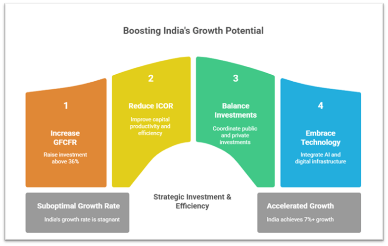 • To push the potential growth beyond 6.5%, India must raise GFCFR by 2 percentage points and reduce ICOR below 5, achievable through deeper private sector participation, productivity-enhancing reforms, and digital innovation.
