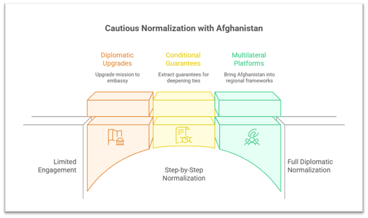 The visit of Afghanistan’s Acting Foreign Minister and the announcement to upgrade the technical mission to a full embassy signal India’s willingness to move slowly toward full diplomatic normalization. Subsequent engagements — humanitarian, development, and security dialogues — should be staged to ensure conditional progress. India can extract guarantees on counterterrorism assurances, women’s rights, and minority protections as preconditions for deepening ties.