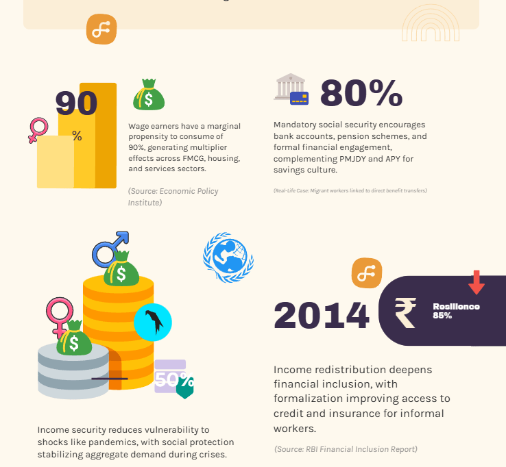 - Example: Workers covered under formal PF and insurance systems were relatively better positioned during the COVID-19 disruptions compared to informal workers lacking such buffers.