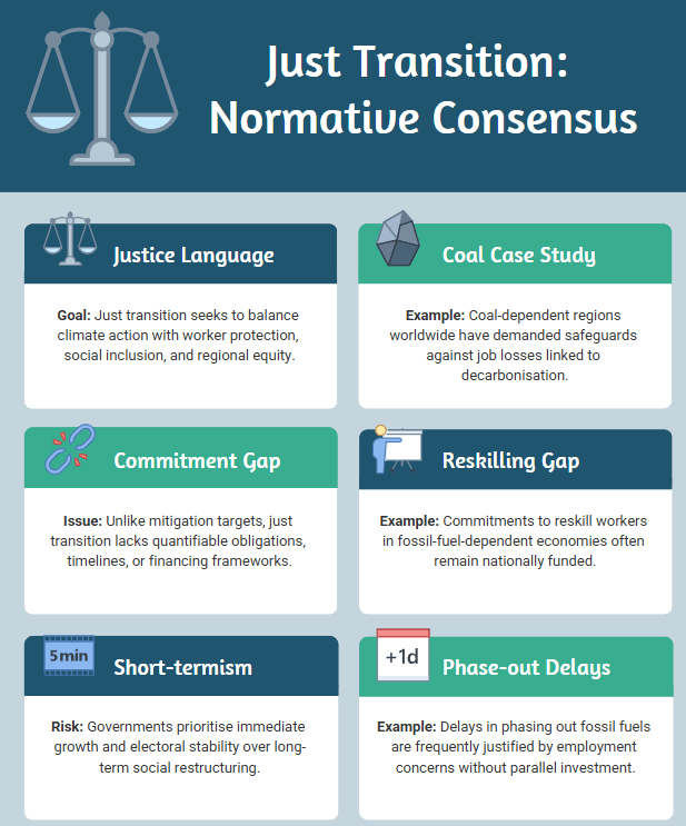 Example / Case Study: Coal-dependent regions worldwide have demanded safeguards against job losses linked to decarbonisation.