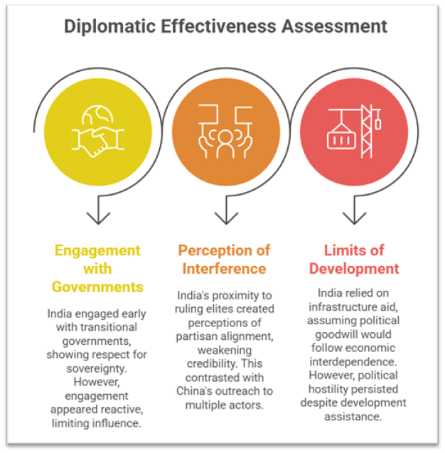 - Despite structured mechanisms like Joint Consultative Commissions, India’s engagement appeared reactive rather than anticipatory, limiting influence over evolving political narratives.
