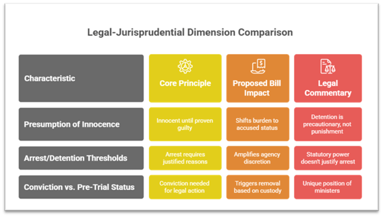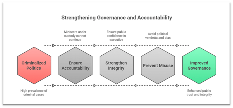 The proposed legislative framework seeks to reconcile the twin imperatives of ministerial accountability and public trust in governance on the one hand, and the presumption of innocence and fair trial rights on the other. While the high prevalence of criminal cases among elected ministers (47% ministers facing cases; 40% Chief Ministers facing cases) underscores the urgency for reform, shifting the trigger from conviction to 30-day detention raises significant jurisprudential and policy concerns. By embedding due process safeguards and balancing the presumption of innocence with ministerial responsibility, the legislation can enhance integrity without undermining fundamental rights.