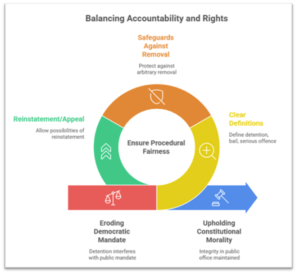The Bill aims to enforce constitutional morality—ensuring individuals holding public office maintain integrity and are above serious criminal cloud. This is aligned with governance reform aspirations. However, any framework for removal must ensure procedural fairness, clear definitions (what constitutes “detention”, when bail is granted, what counts as “serious offence”), safeguards against arbitrary removal, and possibilities of reinstatement or appeal. The current threshold of 30 days may be too low, especially when judicial remand and investigation often exceed this.