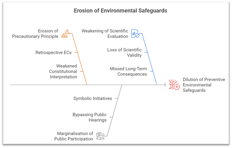 • Retrospective ECs convert the EIA process from a substantive safeguard into a procedural ritual. Once a project is built, the scope for altering location, design, or technology is minimal.