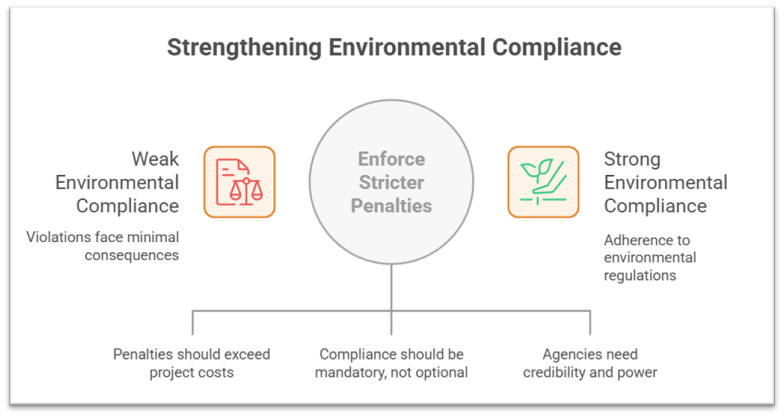 • Initiatives such as Digital India–enabled environmental monitoring systems or Continuous Emission Monitoring Systems (CEMS) become less effective if rule violations face minimal consequences.