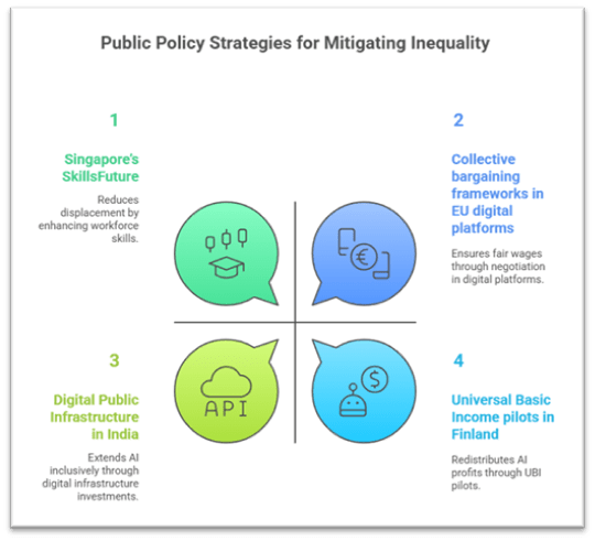 - Policy tools such as Universal Basic Income (UBI) pilots in Finland and the UK highlight ways to redistribute AI-driven profits.