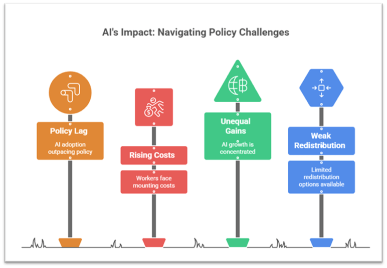 AI adoption is outpacing institutional adaptation, as seen in the 12,000 job cuts by a major Indian IT firm shifting to AI. Bureaucratic inertia delays effective safety nets, risking an interim period of prolonged wage stagnation, akin to historical Engels’ pause. Even strong welfare economies struggle: MIT research shows 95% of AI pilots are yet to deliver tangible productivity gains, reflecting mismatch between policy intent and industry readiness.