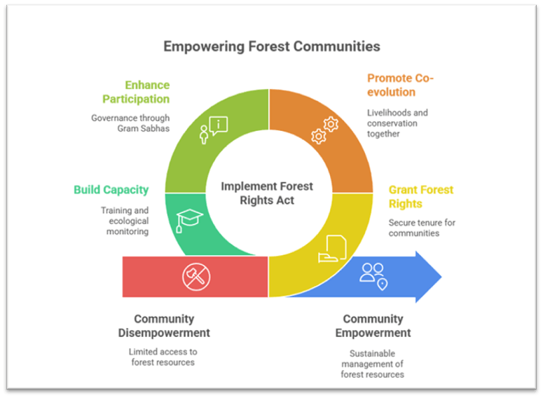 - The Forest Rights Act (2006) marked a paradigm shift, legally recognising the rights of forest dwellers to inhabit and manage forest lands, aligning conservation with social justice.
