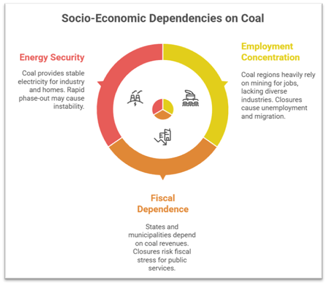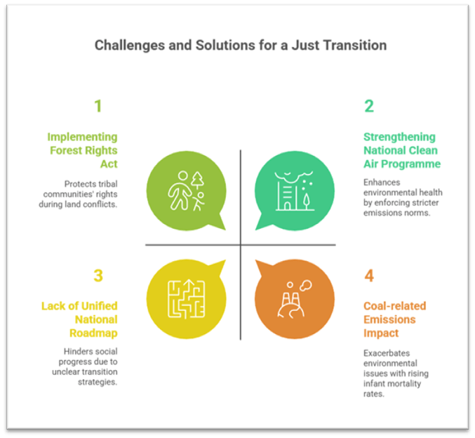 • Regions such as Dhanbad or Talcher face skill deficits and infrastructure gaps, preventing seamless absorption of displaced workers.
