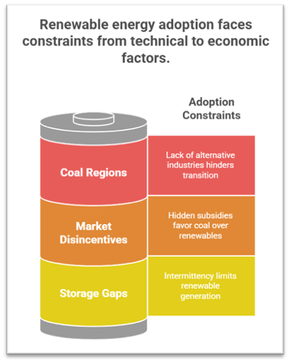 • Coal often appears economical due to hidden subsidies, long-term PPAs, and low external cost accounting. Renewables face hurdles such as curtailment, payment delays, and land acquisition.