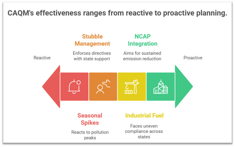 - While CAQM can issue binding directions, enforcement capacity ultimately rests with State governments and local agencies, leading to uneven compliance.