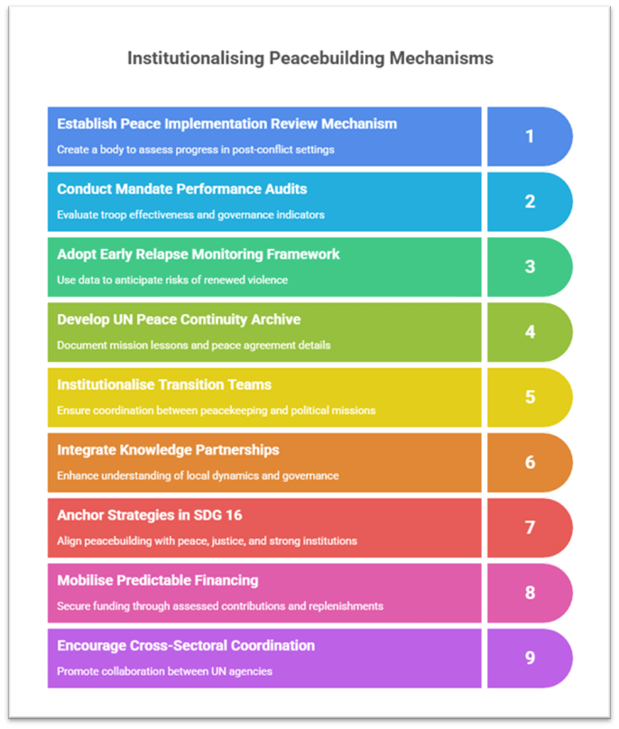 • Ensure mandate performance audits—evaluating not only troop effectiveness but also governance, reconciliation, and institution-building indicators—are made public to enhance transparency.