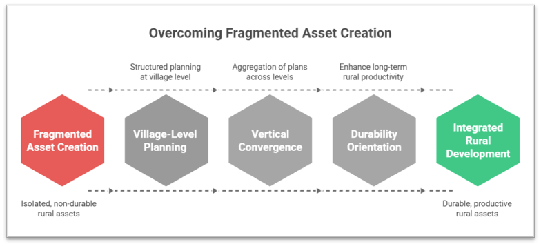 • Aggregation of village plans at block, district and State levels enables convergence with agriculture, water conservation, housing and livelihood missions, addressing the earlier problem of isolated and non-durable assets.